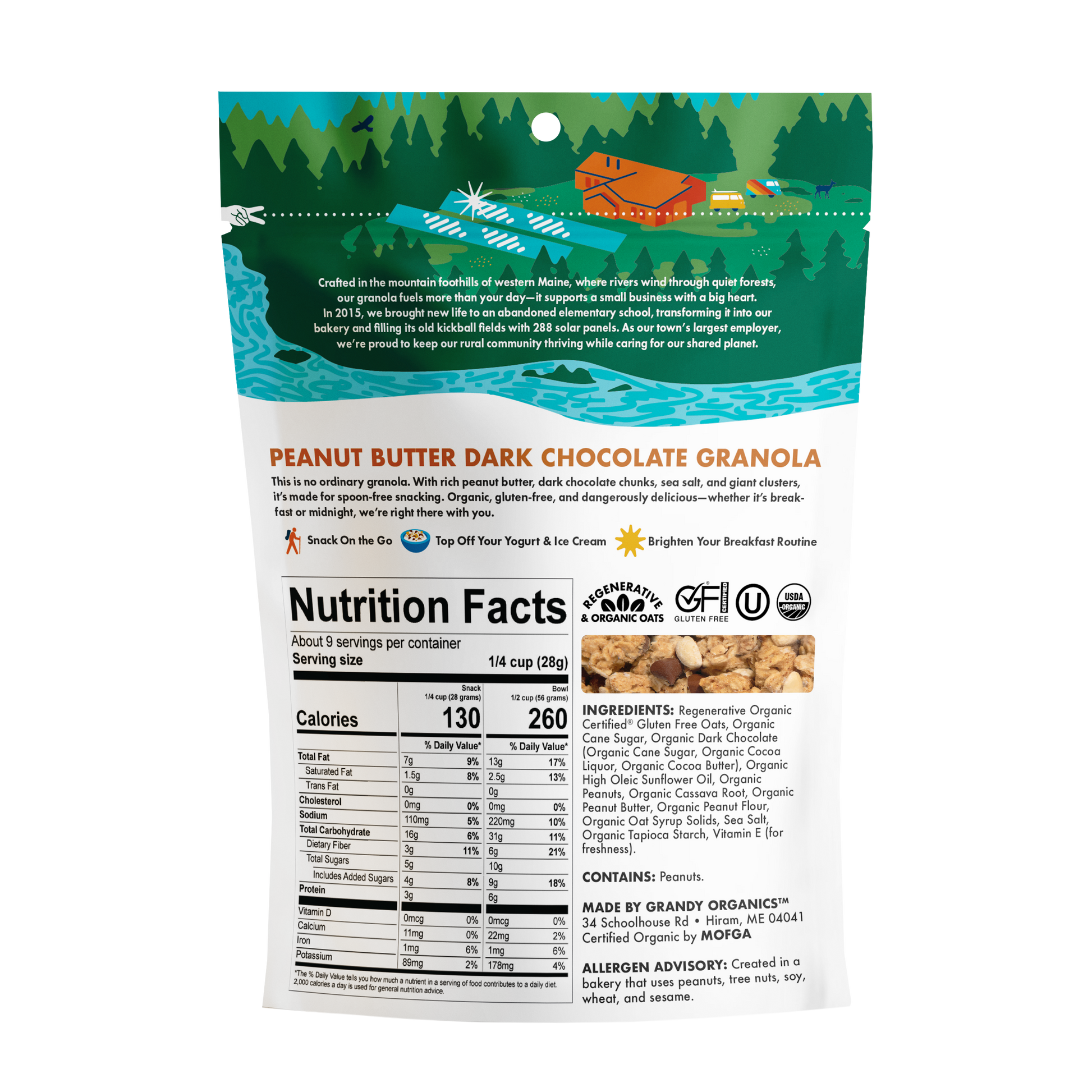 Ingredients: Organic Certified Gluten Free Oats, Organic Cane Sugar, Organic Dark Chocolate (Organic Cane Sugar, Organic Chocolate Liquor, Organic Cocoa Butter, Organic Soy Lecithin, Vanilla Extract], Organic High Oleic Sunflower Oil, Organic Peanuts, Organic Soluble Tapioca Fiber Syrup, Organic Peanut Butter, Organic Peanut Flour, Organic Oat Syrup Solids, Organic Tapioca Starch, Vitamin E